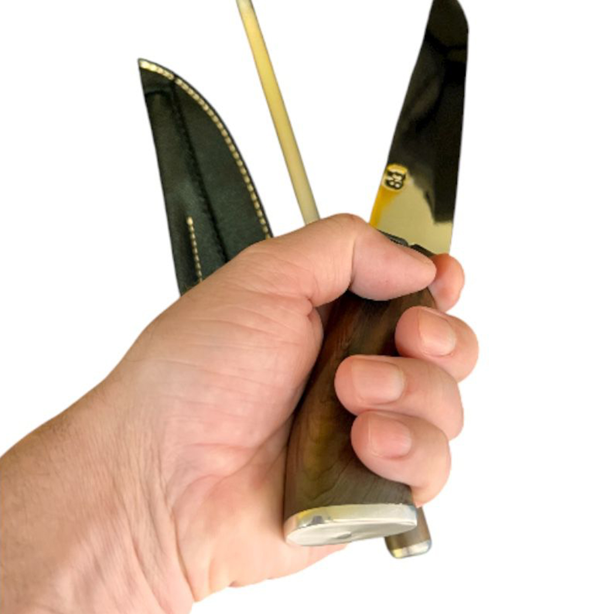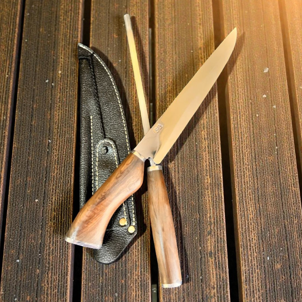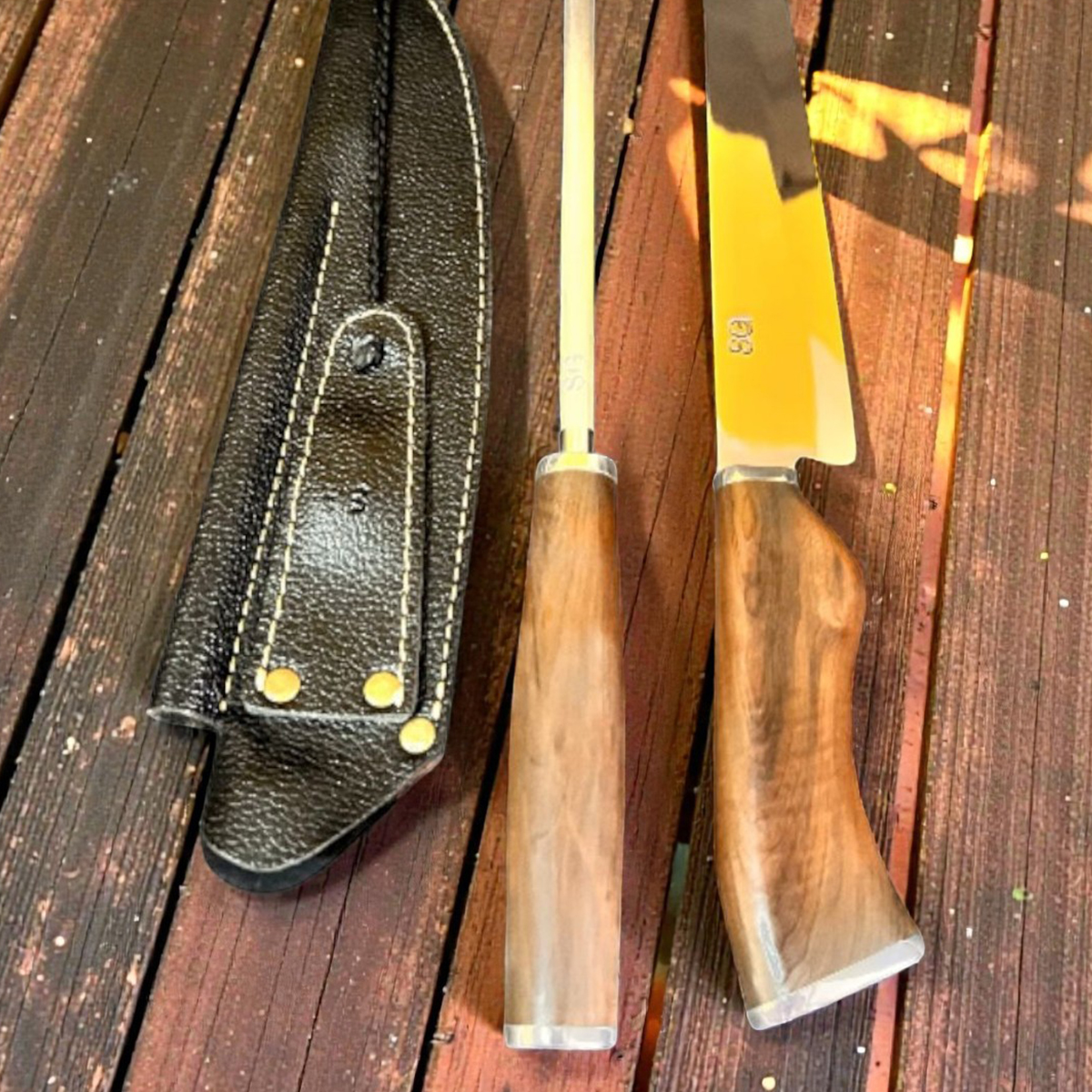 Conjunto faca e chaira c/ bainha SG churrasco, aço inox cirurgico, peça integral, entre cabo (espiga), lâmina, proporcionando-lhe alta resistência e tenacidade, e, também, ótima manutenção de fio!