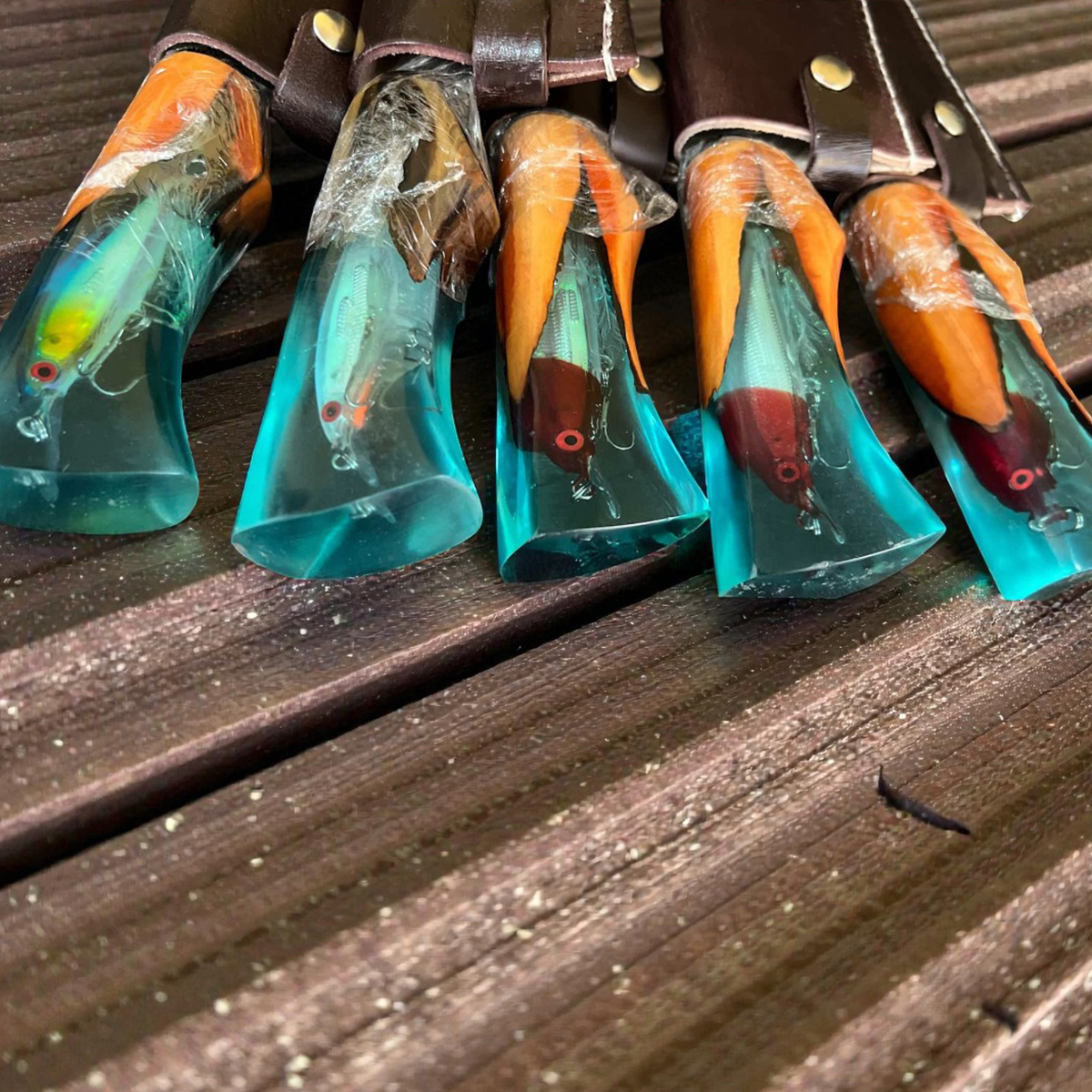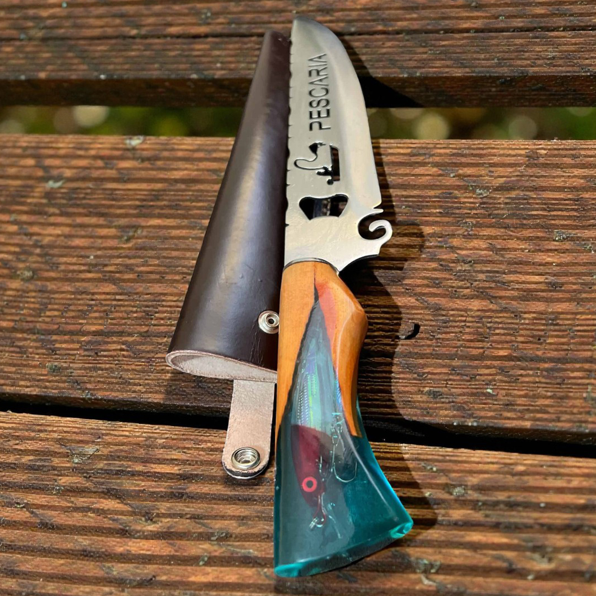 FACA PICANHEIRA NOSSA SENHORA 10" EM AÇO INOX 420C CABO HÍBRIDO – RESINA EPOXI E MADEIRAS NOBRES, COM ISCA PEIXE DE DETALHES NO INTERIOR DA RESINA