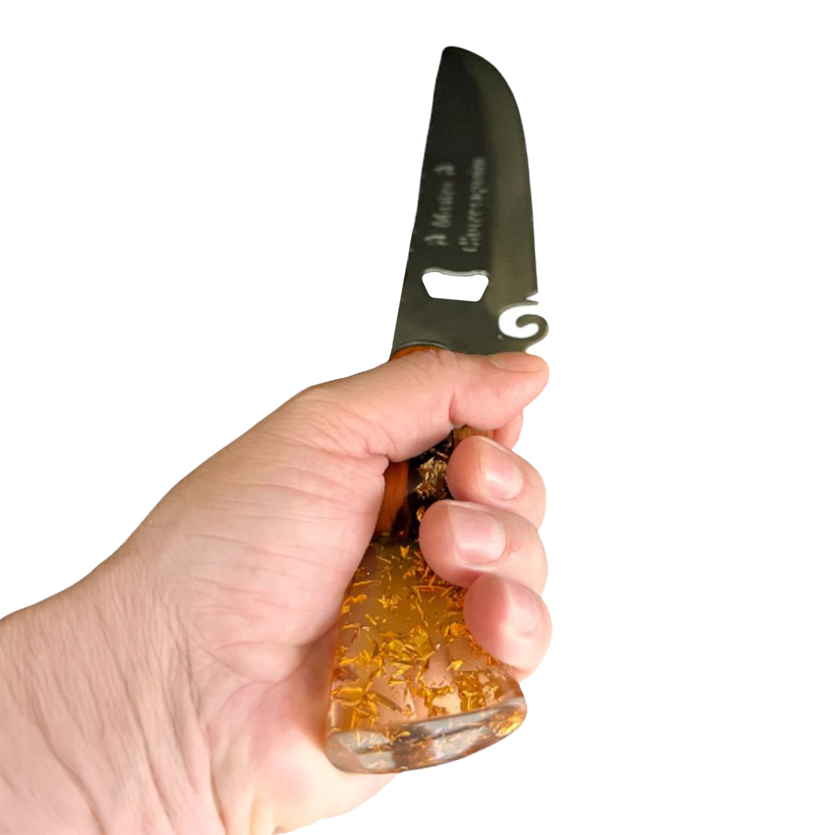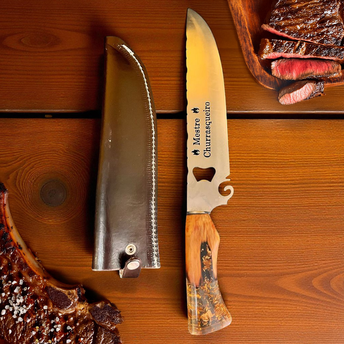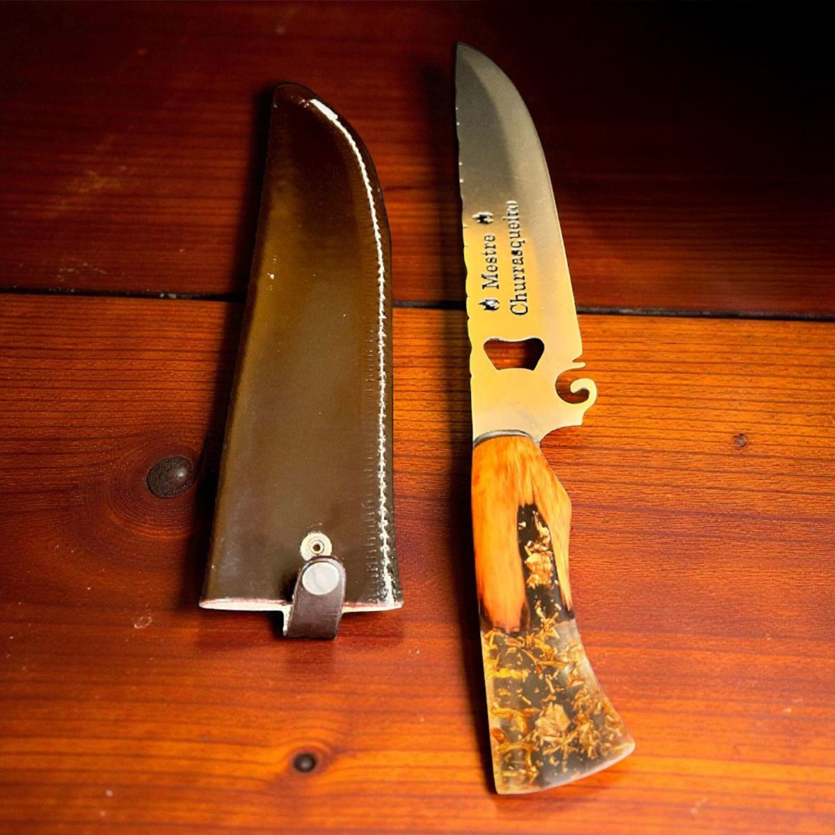FACA PICANHEIRA NOSSA SENHORA 10" EM AÇO INOX 420C CABO HÍBRIDO – RESINA EPOXI E MADEIRAS NOBRES, COM DETALHES NO INTERIOR DA RESINA