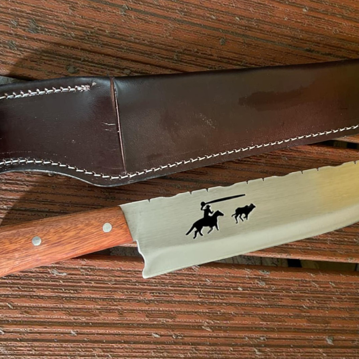 FACA PERSONALIZADA CABO MADEIRA E BAINHA EM COURO