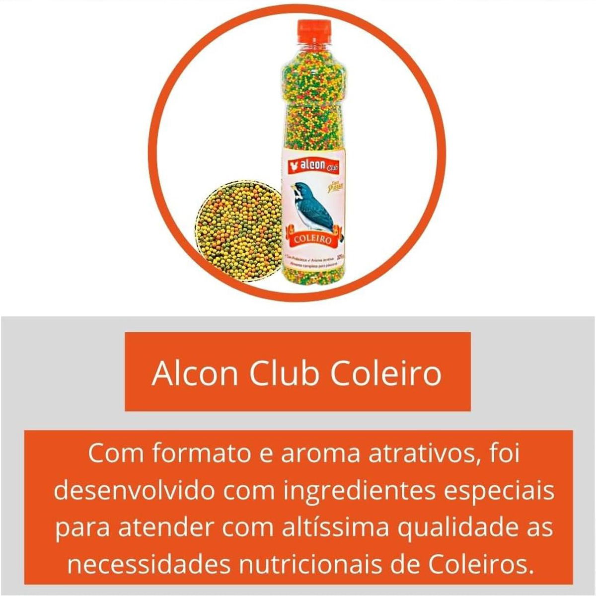 Alcon Club Coleiro Super Premium é um alimento com formato e aroma atrativos, desenvolvido com ingredientes especiais para atender as necessidades nutricionais de Coleiros, Pixoxós, Caboclinhos e Bigodinhos. Contém vitaminas e minerais de alto padrão, além de Prebiótico que promove o crescimento seletivo de bactérias benéficas presentes nos intestinos, melhorando o aproveitamento dos nutrientes. Contribui com a higiene e facilita o manejo, pois não há necessidade da rotina diária de limpeza dos comedouros, como ocorre com sementes e alimentos frescos. O alimento pode ser fornecido para vários dias.